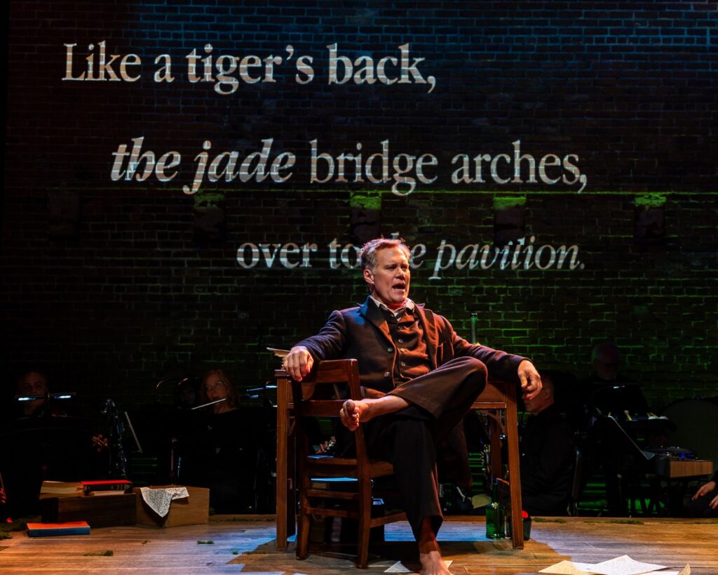 It is not that the staging’s idea is bad; it is just that it tries too much and achieves little. Bogart designates the tenor part as “The Poet” and the mezzo as “The Lover;” then she introduces a third wheel: a spoken character called “the Mother.” They inhabit the same stage but technically do not see each other. The plot, if there is one, might be this: a drunk poet, a woman who finds his poetry, and a mother who has just lost her son and tries to deal with grief (an evident reference to Mahler’s deceased infant daughter).