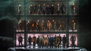 “Silent Night” is a dramatization of the real-life Christmas Truces of WWI, when opposing units (in this case French, Scottish, and German) decided to observe a temporary ceasefire and spent Christmas together in 1914. The production leans heavily into the morbid absurdity and tragic cost of war. Projected names of WWI casualties slowly scrolled across the proscenium scrim before and after the opera, and during intermission. The opera began and ended with a backdrop of a giant tombstone, and the trenches of the set looked like they were made of marble, designed by Erhard Rom to look like a mausoleum. Built in Cardiff at the same facility the Met Opera commissions from, it has three levels, with no-man’s land downstage center on the apron. Projections on the scrim provide additional texture and detail to various scenes and transitions. The shape of the set enhanced the acoustics, and I hope companies beyond the three involved in creating this production rent the set in the future.