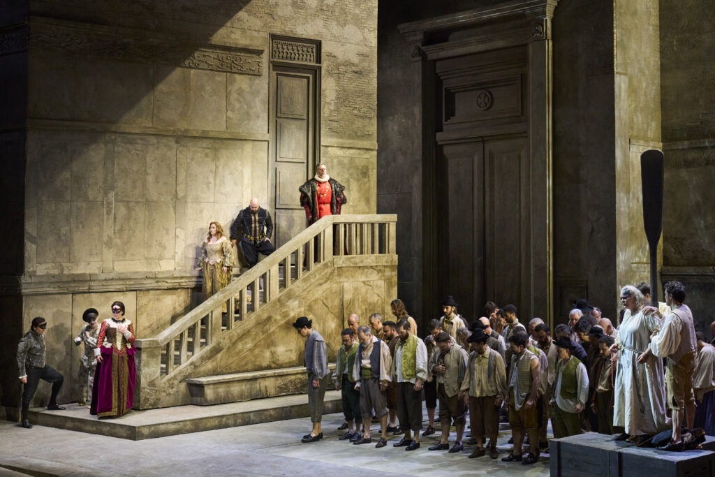 The sets by Étienne Pluss were beautiful and meaningful. The stage was surrounded by walls of stone and wooden beams. There were realistic elements for each scene, including a big marble staircase in the first act, a boat in the second, and chandeliers in the third. It was a very pleasant experience to be able to recognize onstage what the opera was about and where the action was set, instead of spending the whole show wondering what the director was trying to say. Meanwhile, the costumes were rich period pieces from Christian Lacroix. It was a beautiful production to see.