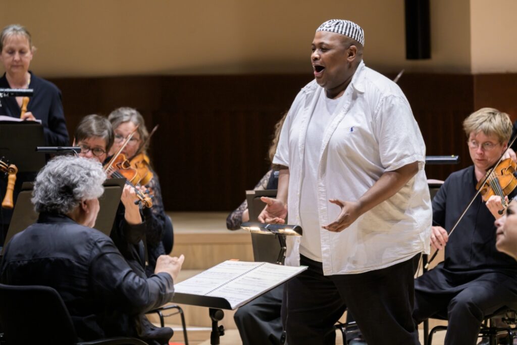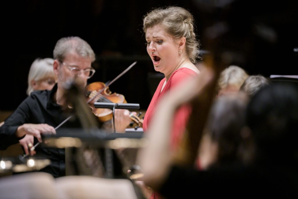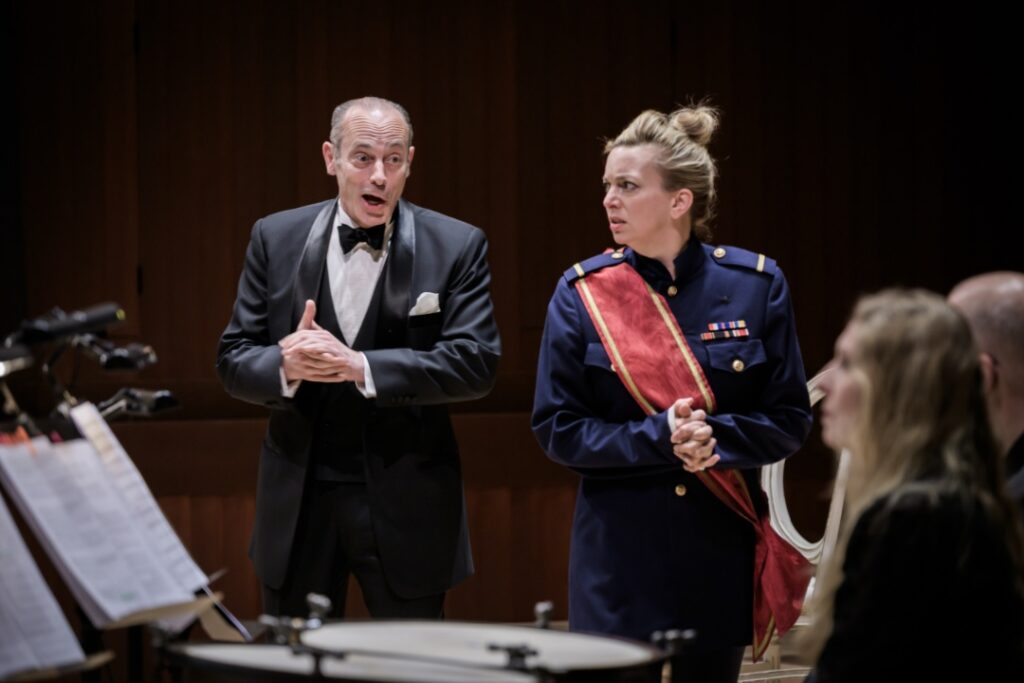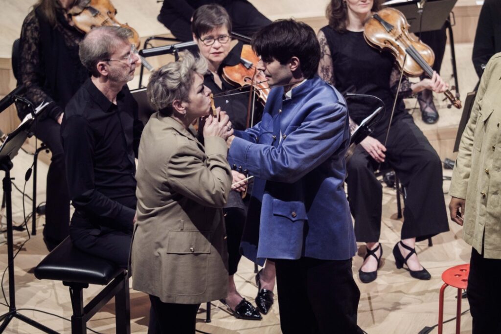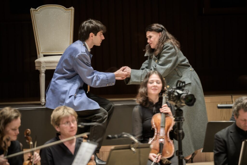 Even within a concertante setting, Jacobs provided a masterclass in dramaturgy. With minimal props and clever sartorial shifts, the “rise and fall” themes of the opera were rendered with immediate, often humorous clarity. We saw Arianna and Vitaliano trade royal finery for the plain clothings of captives; Giustino transitioned from a simple straw hat to a blue uniform adorned with a Christian cross; and the villainous Amanzio swapped his courtly evening wear for a stiff military uniform upon seizing power. Bathed in the effective lighting of the Wolfgang-Marguerre-Saal, these visual cues mirrored the fickle wheel of La Fortuna.