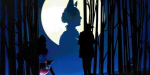 Maree Kearns’ simple set designs, consisting of a series of wooden panels fashioned to resemble the forest, were convincing. The use of ramps between the panels meant that the stage had a layered effect that provided depth and a secluded place for the foxes’ den, while Saileog O’Halloran’s bright, colorful costume designs exaggerated the animals’ cuddly features and added a humorous edge to their characters. It was a staging, however, that did nothing to contradict the child-friendly, comic book impression. It certainly bore no resemblance to an adult fairytale! Most fairytales contain a dark underbelly, a feature that adult fairytales accentuate. They can be bloody, terrifying, or viciously satirical, but the production had nothing of this nature at all. In fact, the production achieved the exact opposite by downplaying the death of the vixen and emphasizing the sentimental.