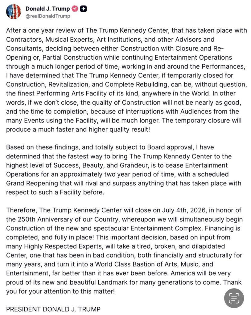 President Donald J. Trump released a statement via Truth Social noting stating that he had made the decision after one year of review. He said, “Based on these findings, and totally subject to Board approval, I have determined that the fastest way to bring The Trump Kennedy Center to the highest level of Success, Beauty, and Grandeur, is to cease Entertainment Operations for an approximately two year period of time, with a scheduled Grand Reopening that will rival and surpass anything that has taken place with respect to such a Facility before.”