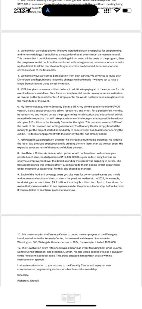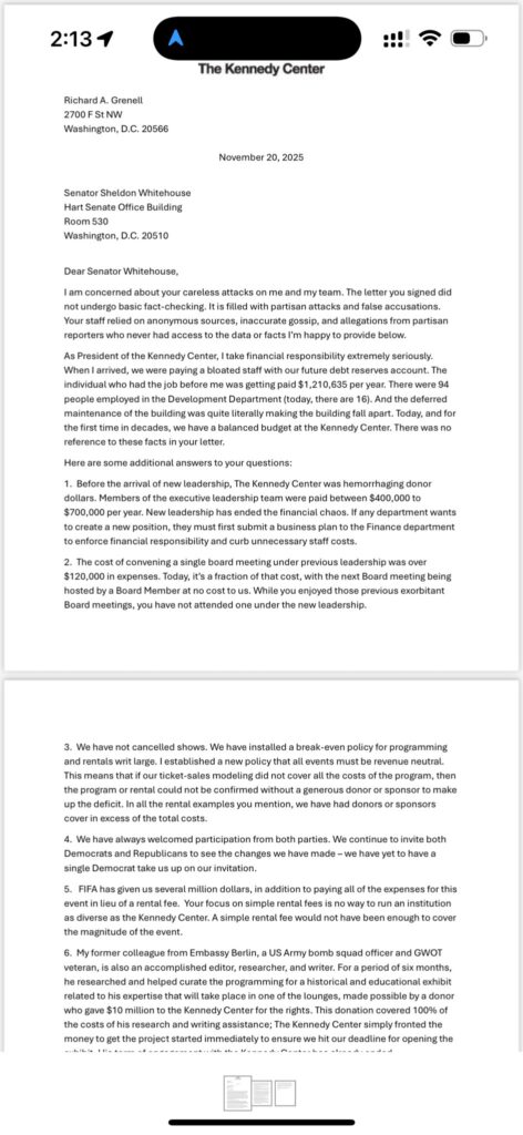 Grenell has denied all the reports and took to social media to disparage journalists and Senator Whitehouse, stating “Senator Whitehouse just stepped in it. He attacked the Kennedy Center with outrageous claims. So we responded with the facts. Oh boy – the facts are so clear: the NYT and the Senator’s letter writer are going to be embarrassed. We have a balanced budget, we’ve raised a whopping $117 MILLION under Donald Trump – and FIFA has paid millions plus covered all expenses (the NYT made a gigantic mistake by assuming FIFA was a rental not a major Sponsor).”
