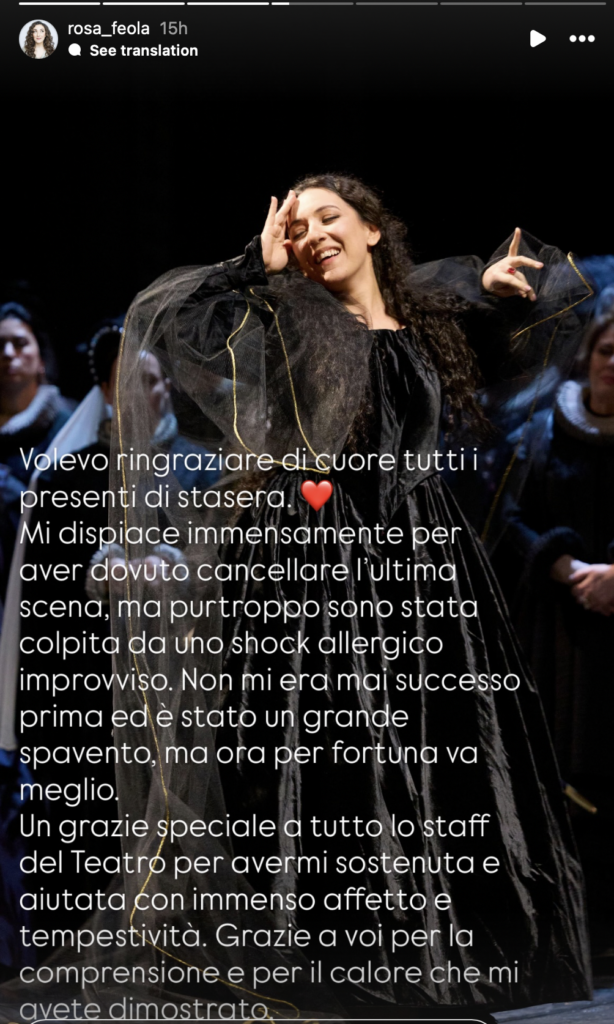 According to the Italian publication Connessi all’Opera, during the only intermission, the company announced that soprano Rosa Feola fell ill and was trying to recover. After a prolonged intermission, the company said that the show would go on and conductor Francesco Lanzillotta reappeared at the podium with the orchestra. However, the conductor suddenly disappeared and another announcement was made that soprano Feola would not continue the performance.