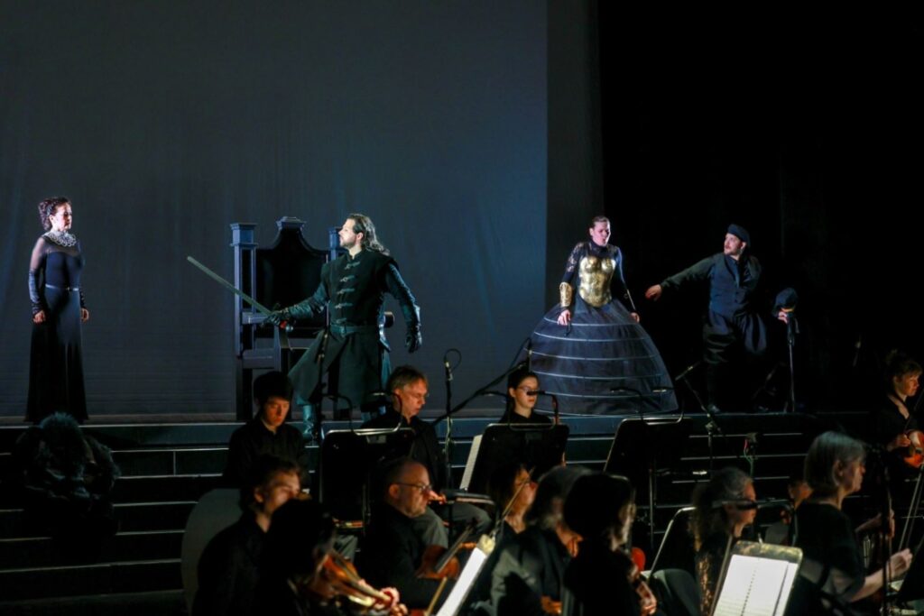 The production utilized a semi-staged minimalism approach that leaned heavily on digital projection. Aside from a single physical throne, the world of the opera was constructed through digital projections of hand-drawn imagery representing ships, forests, palaces, and battle scenes. Unfortunately, these visuals functioned merely as basic atmospheric cues; the transitions were as clunky as early-century slideshows, lacking the fluid sophistication. Furthermore, the entire stage remained shrouded in a persistent, unchanging darkness for three and a half hours, creating an oppressive atmosphere that tested the audience’s endurance.