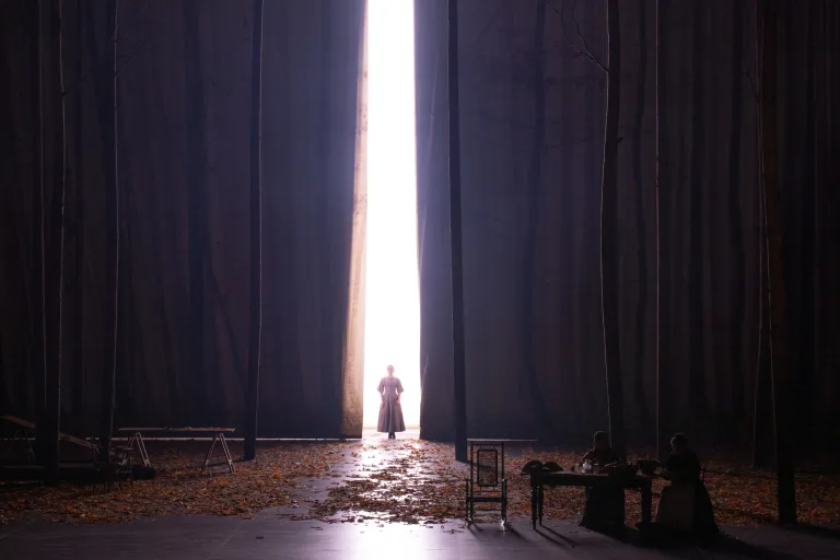 Michael Levine’s sets are equally straightforward. The curtain parts to reveal Madame Larina and the nurse Filippyevna seated at a table outside peeling fruit for preserves. A backdrop of birch trees extends the vista into the distance. Fallen leaves cover the ground, which the peasants kick up as they celebrate the harvest.