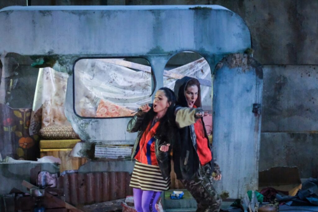 The production, featured December 7 to 17, gets off to a wonderful start. It is set in present day and in a poor wasteland, where the children Hansel and Gretel try to distract themselves from “the hunger that bites them” (“Ei, wie beisst mich der Hunger!” says Gretel at the beginning of the first act) by singing and dancing. The adults, meanwhile, take refuge in alcohol. The family caravan has a broken window and is surrounded by plastic bags. The director, who also designed the sets and costumes, successfully combines fantasy and realism, punctuating the scenography with very well-chosen references. In the second act, the Pink Fairy and the Sandman resemble Stephen King’s killer clown Pennywise, inspired himself by the homosexual pedophile serial killer John Wayne Gacy, who dressed up as a clown to gain the sympathy of his victims’ parents, or the arrival of the Sandman on a swan, like Lohengrin, showing the Wagnerian inspiration of the work. Even the silent dancers who walked on their hands or on all fours on their backs while sleeping in the forest, and painted with skulls, seem justified. The acting is also very good, with Hansel dancing as if in an MTV rap video, for example.