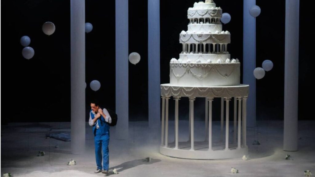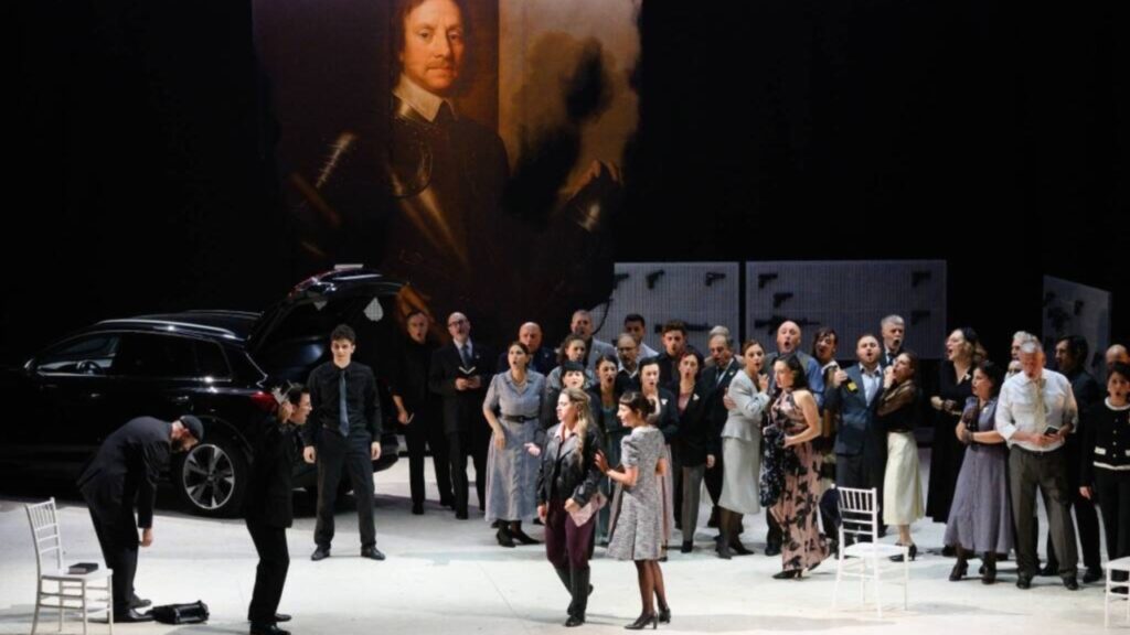 OperaLombardia revived this cornerstone of bel canto with a new production touring five northern Italian cities, including Cremona: the focus of this review. Daniele Menghini’s staging relocates the action to a violent contemporary community steeped in fanatical worship of a “Puritan” past. Davide Signorini’s set design creates a somber space where seventeenth-century relics coexist with modern objects: a real automobile, multiple firearms, helium balloons, a monumental wedding cake, industrial rice sacks, and more. The regista thus shapes a microcosm of violence and identity-based fanaticism, reinforced by Nika Campisi’s costumes, which blend classical elements (Elvira’s wedding dress, men’s suits) with vulgar ones (Enrichetta in sweatpants, Arturo in Converse sneakers on his wedding day). Gianni Bertoli’s meticulous lighting completes the stage concept.