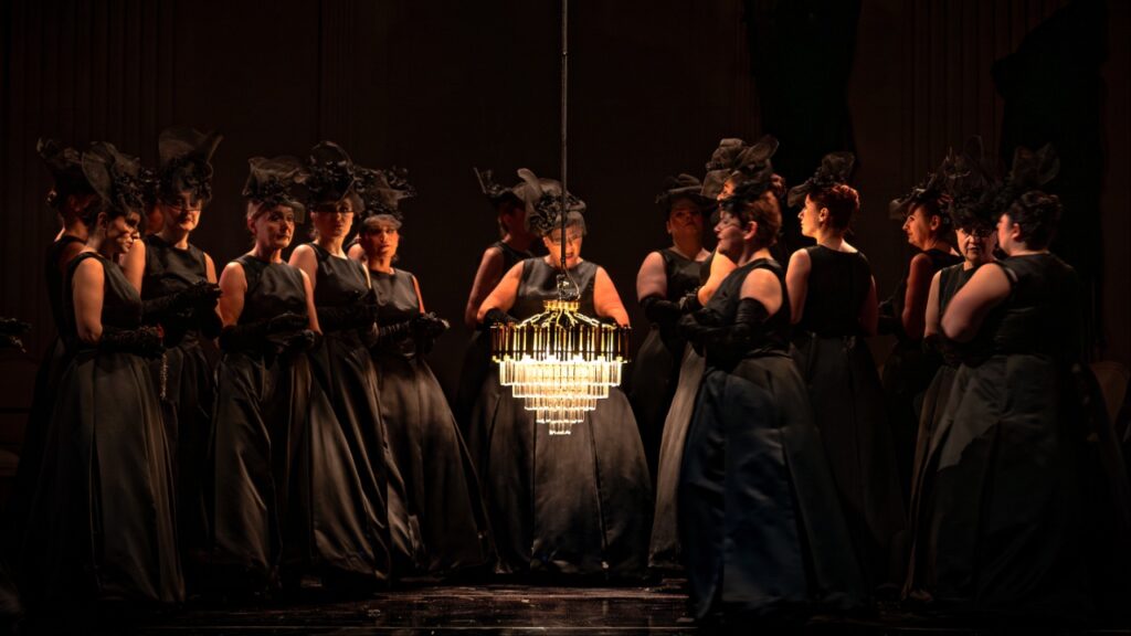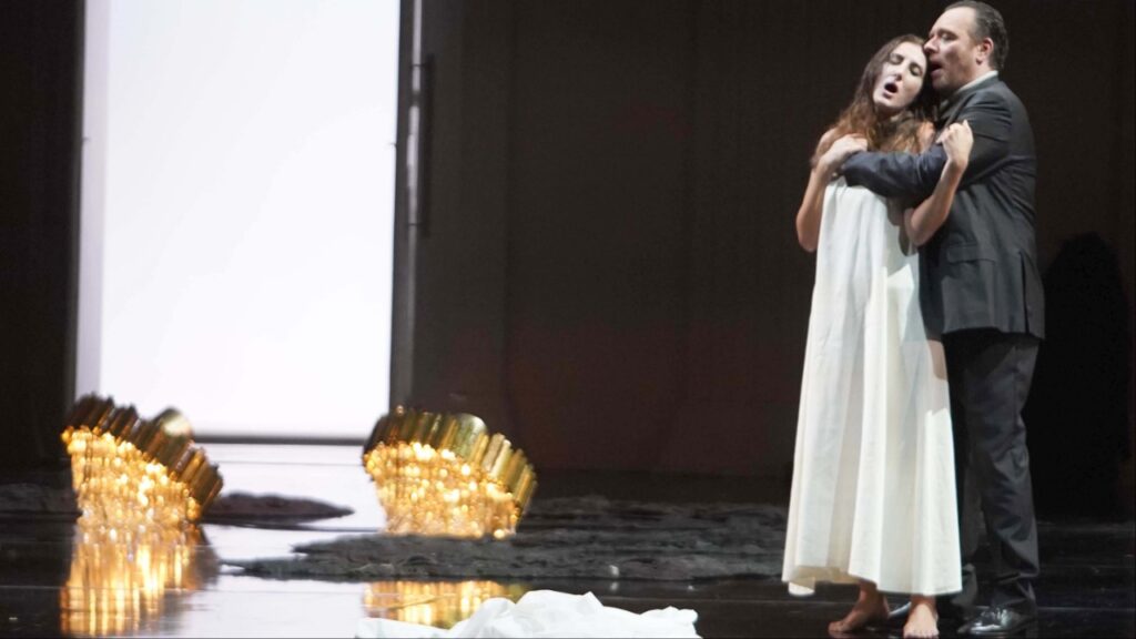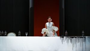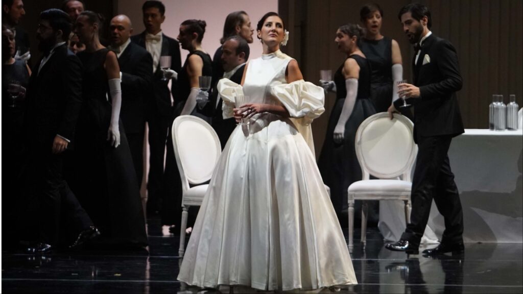 The stage design, common to all three operas and created by Mariana Moreira, consisted of an elegant neoclassical wall: a neutral, mutable environment in which the dramatic essence of each work intertwines while retaining its individuality. A nearly empty stage was filled with just a few symbolic elements: candlesticks, an armchair, a divan, a table, and a bed, simple yet meaningful, providing coherence and atmosphere. Veronica Pattuelli’s costumes contributed modern elegance and restraint: Violetta appeared always dressed in pure white, contrasting with the black suits of the male protagonists and the chorus, reinforcing the symbolism of purity and death. Silvia Vacca’s lighting completed a clean and visually cohesive aesthetic, precisely highlighting the emotional and spatial focus of the drama.