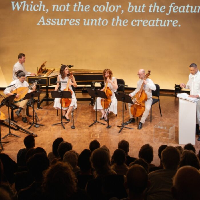 Mezzo-soprano Sasha Cooke sang with intelligence and care in the title role. She made a handsome young man, but her voice, while lustrous, lacked the power and passion the role required. Her “PTSD” version of madness seemed confined, perhaps beyond the formal structures the music itself required. Her facial expression, including her eyes, certainly conveyed the internal difficulties she was undergoing; however, her head and her body remained too restrained to convey the breakdown. Her presence on stage, directed mid and upstage rather than closer to the audience downstage, kept her struggle more distant. Her beautiful voice remained more hooded and constrained. When she stepped up to the famous aria, anticipation was high. Even the colorful slides and collages bursting like fireworks behind her, however, her commitment to the madness at hand seemed dilute.
