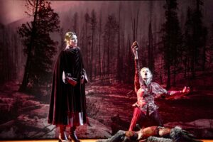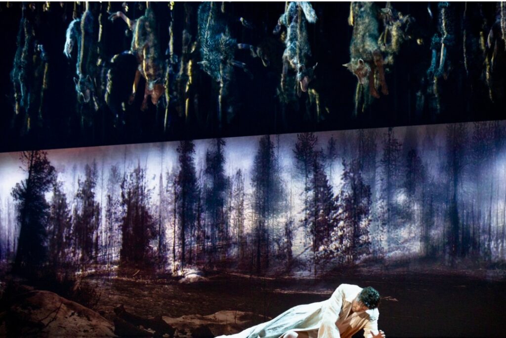 Director James Darrah Black has the characters perform in twelve impressive, if enigmatic, rooms designed by Adam Rigg, complemented by Molly Irelan’s imaginative costumes. After the first scene with projections of a forest, at least two dozen very naturalistic stuffed wolves suspended from meat hooks descend from the fly tower. Is this drastic symbolism an allusion to the dictum of the English philosopher Thomas Hobbes (1588-1679) “in the state of nature, man is a wolf to man”? In any case, this interpretation would fit conclusively into the further philosophical references of the production.