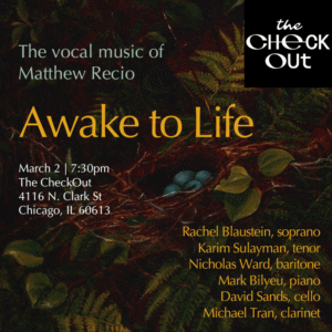 By David SalazarChicago’s The CheckOut is set to present “Awake to Life,” an evening of vocal works by composer Matthew Recio, on March 2, 2026.