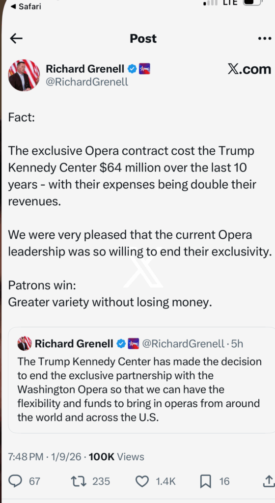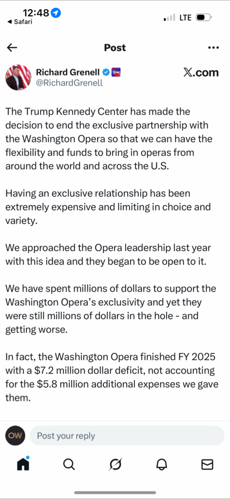 Executive director Richard Grenell then responded via X with contradictory statements. First he said, “The Trump Kennedy Center has made the decision to end the exclusive partnership with the Washington Opera so that we can have the flexibility and funds to bring in operas from around the world and across the U.S.”