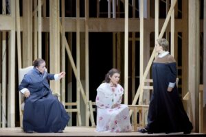 The production presented an effective and creative way to make the most of the various dynamics at play. The set was a large, open-frame wooden construction of rooms and stairs. It revealed, as warranted, different parts of the convent, the Marquis’ home, and other locations—all at the same time.